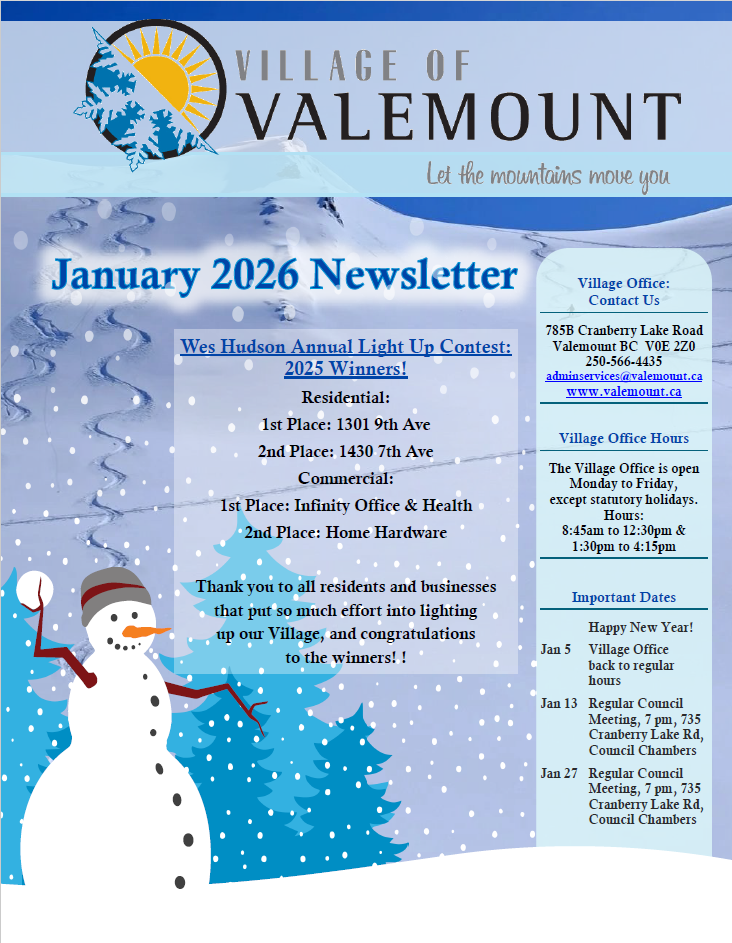 The October 2025 Newsletter has arrived on the brisk autumn breeze. Read up about the upcoming Air Quality Survey, the next phase of the Valemount Accessibility Plan, the next...